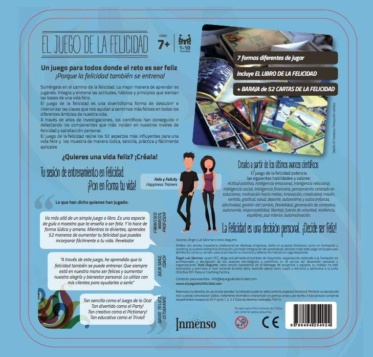 Nadie nace sabiendo. Entrena cada día tu felicidad +2 años de investigación científica para ayudarte a ser feliz mientras juegas Talleres presenciales para empezar a trabajar tu felicidad en tu vida personal ¡Haz feliz a tu equipo! Talleres en conseguir el mejor ambiente todos los días ¡Sabemos cómo hacerte reír!MÁS CONSEJOS AgendaVERAgenda de la Felicidad 9,95€ Añadir al carrito JUEGOSVERJuego Completo (Tablero + Libro + Baraja) 49,90€ Añadir al carrito Descubre algunos de las ventajas de nuestro juegoDisfruta regalando nuestro juegoCualquier momento es bueno para ser felizCualquier ocasión es buena para ser felizHoy es ese díaMomentos especiales en familiaQuiero jugar con mis hijos